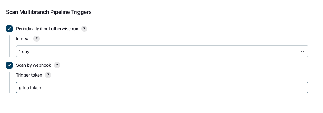 scan multibranch pipeline triggers 부분에서 두개다 체크해주시고, 토큰이름을 정해서 적어주시고, 저장해주세요.