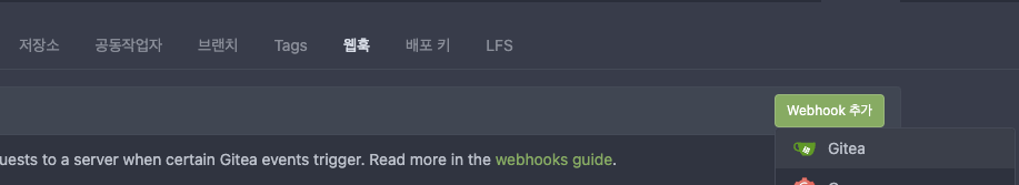 웹훅으로 들어가 추가 - Gitea를 해줍니다.