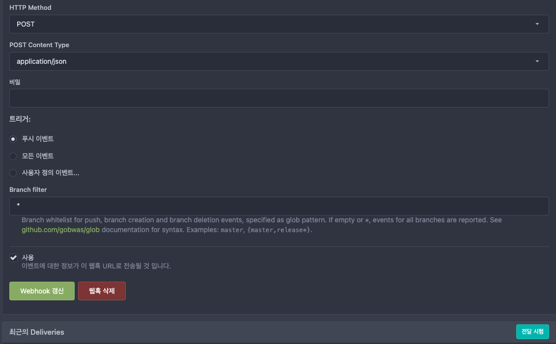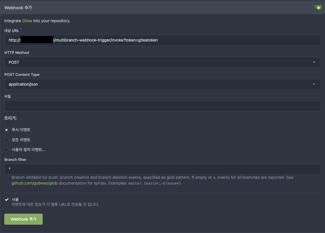 http://젠킨스주소/multibranch-webhook-trigger/invoke?token=아까젠킨스에서 만든 토큰