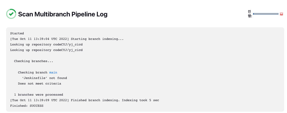 정상적으로 Jenkinsfile이 찾아진것을 볼 수 있습니다.