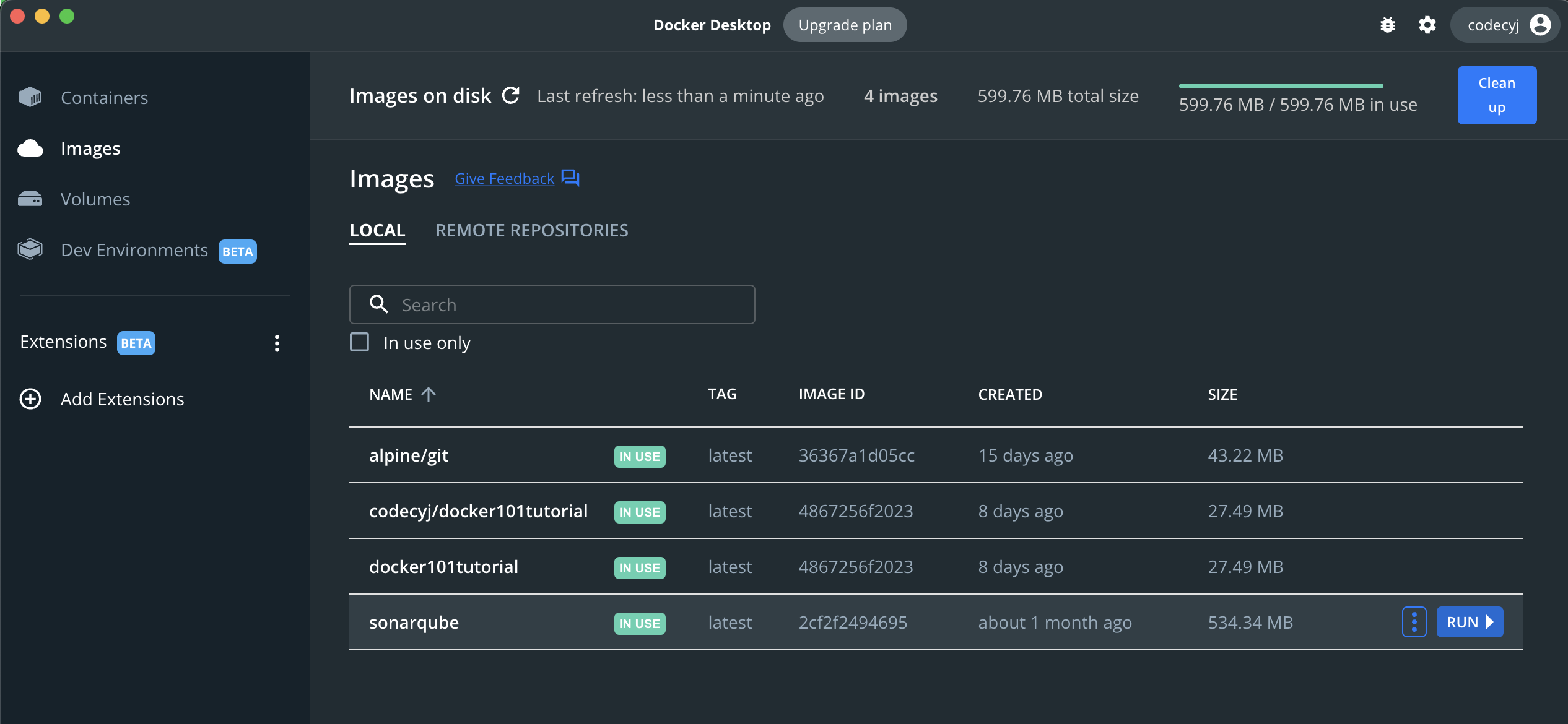 docker images를 눌러서 sonarqube가 받아졌는지 확인합니다.