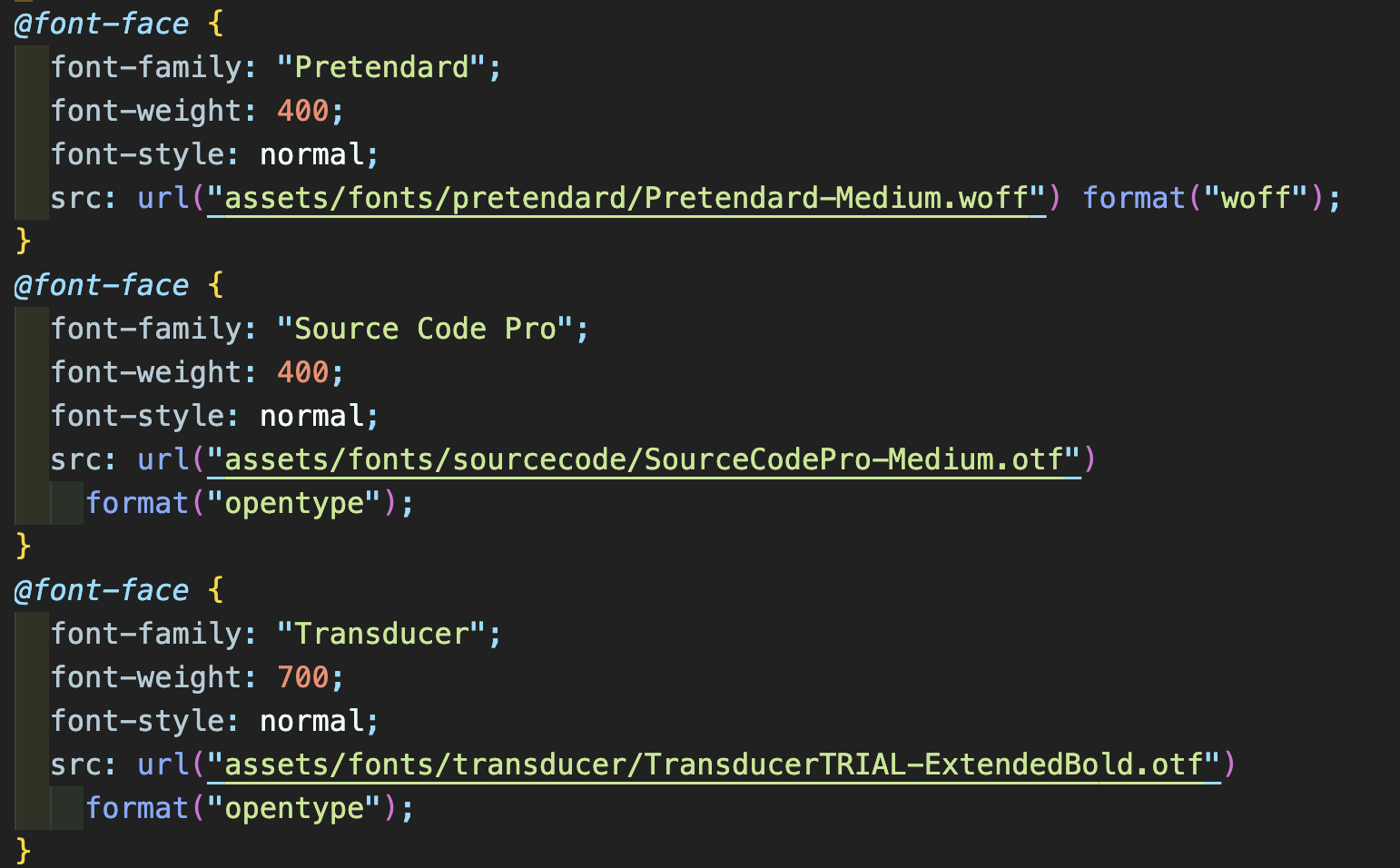 제일 중요한 점은 otf 파일은 format에 'opentype'을 지정해 줘야 합니다. 왜인지 format('otp')를 먹지를 않습니다.
