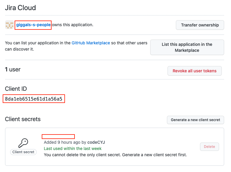 6. OAuth App에 들어와서 Client secrets 생성 (최초 한번만 발급하니 꼭 백업해주세요)