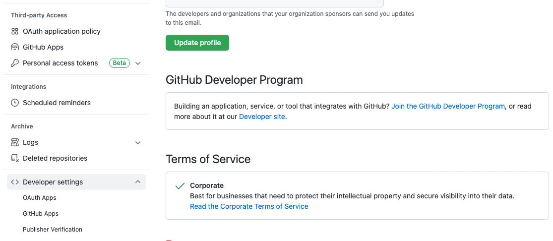 3. 좌측 하단의 Developer settings - OAuth Apps 메뉴를 선택.