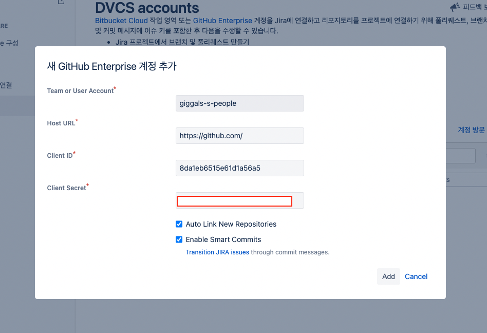 9. 위에서 확인했던 GitHub 정보들을 다음과 같이 입력 후 Add