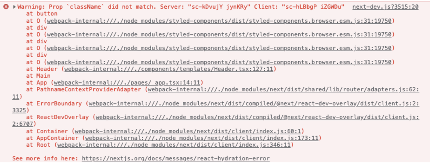Next.js에서 styled-components를 사용하는데 새로고침 할 때 마다 다음과 같은 에러를 발생했습니다.
