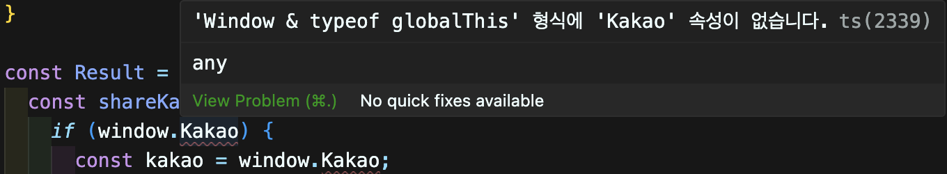 ts를 사용 중이라면 window를 사용해도 'Window & typeof globalThis' 형식에 'Kakao' 속성이 없습니다. 에러가 발생합니다.