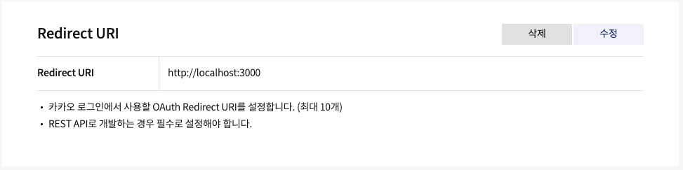 - https://developers.kakao.com/ 에 접속하여 내 애플리케이션 - 애플리케이션 추가하기 등록